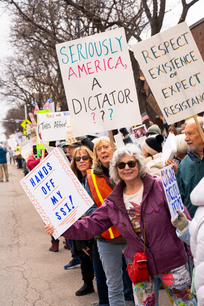 A river of people spilled onto the sidewalks in Longmont on Saturday, April 5, to have their voices heard. An orchestra of “Hands off!” chants, beating drums and supportive car horns stretched for five blocks, lining both sides of Main Street from 4th to 9th Avenue.